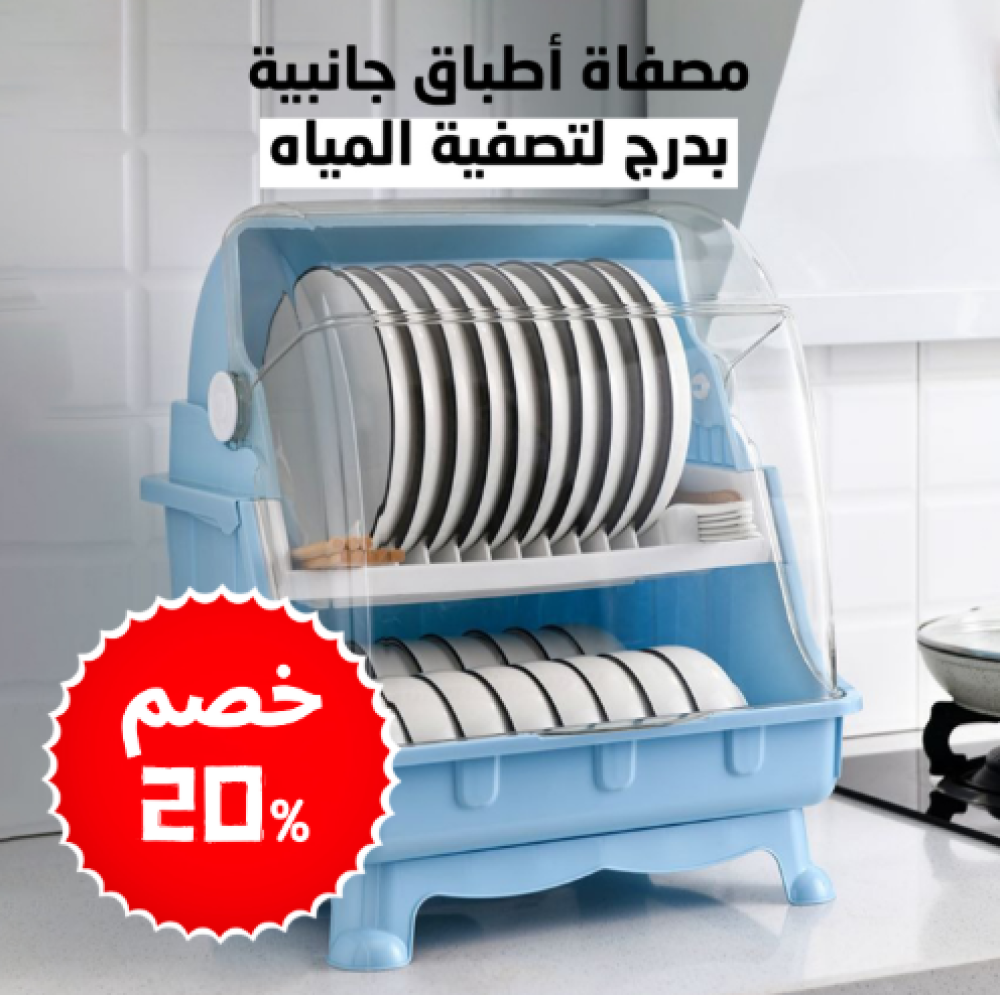 رف تجفيف اطباق مع غطاء عملي يساعد على ترتيب الأطباق والأكواب مع حماية من الغبار، مما يحافظ على نظافة المطبخ ويوفر مساحة مثالية للتجفيف.